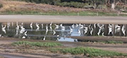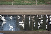 • Low water in the slough brings many species together, yellow flags from a restoration project in the background