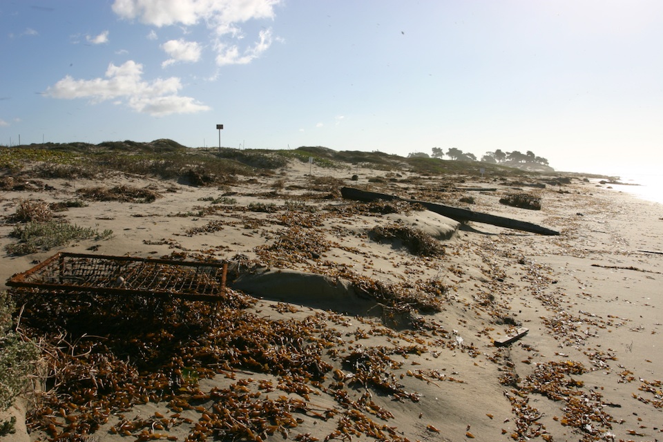 Sand is washed away and kelp is washed in.