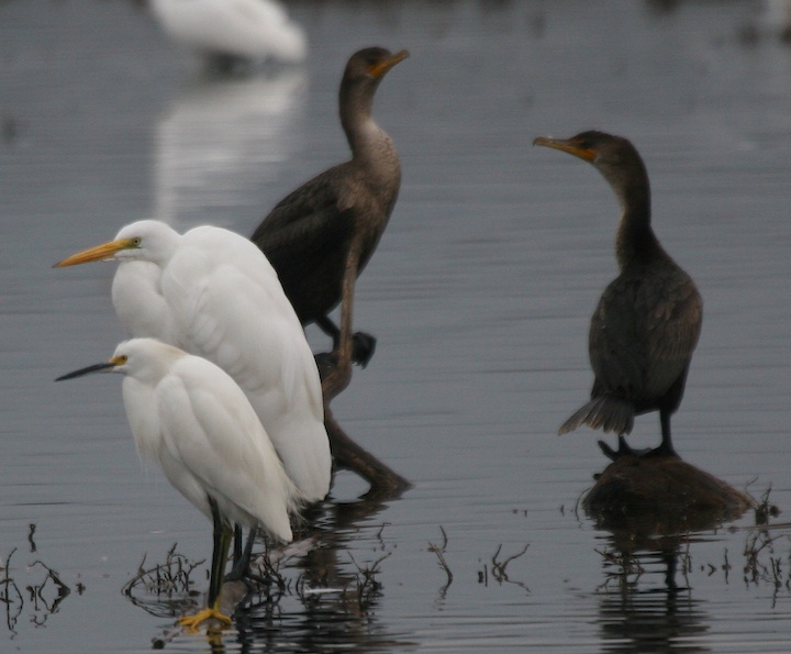 Snowy Egret next to Great Egret and Cormorants