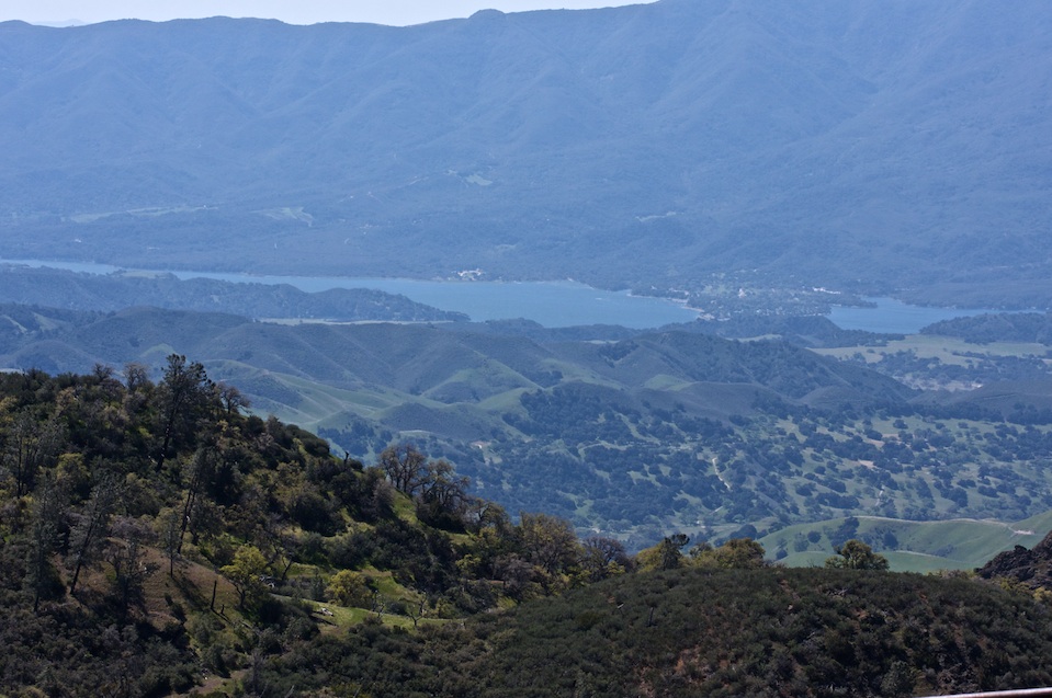 View of Lake Cachuma from the meadow. Full sun - kind of looking into the sun