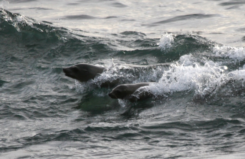 Sea lions surfing